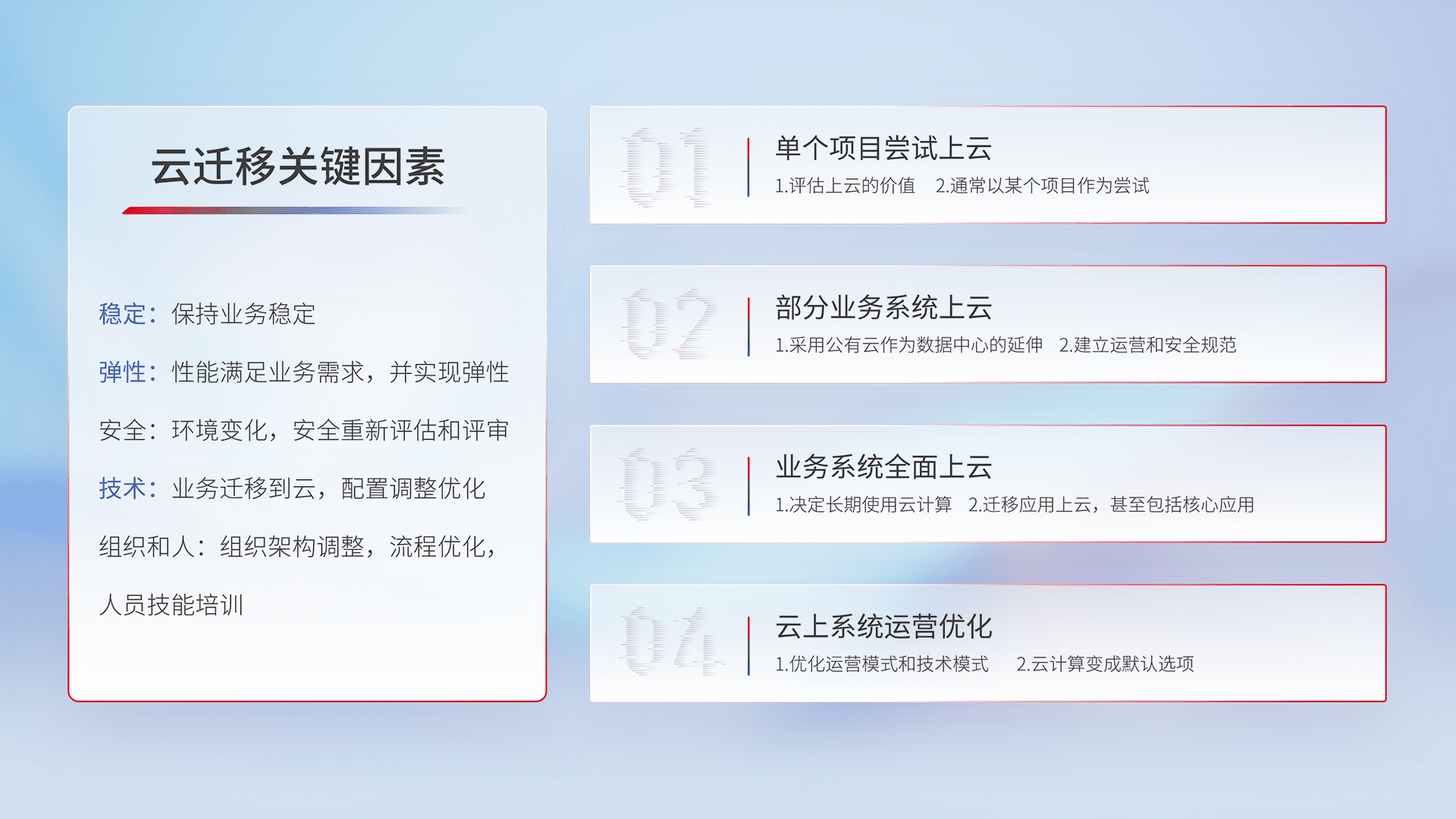 结合实际业务,,,,从规划设计、、、云平台选型、、、云原生改造、、、、数据迁移、、、、集成交付,,迁移全过程为客户识别最佳上云路径,,做好风险识别管理,,,设计网络架构、、、身份权限、、、安全审计合规、、、操作审计、、、日志审计、、、监控告警策略、、、多站点容灾设计等,,对云上基础设施进行整体规划,,,提升IT治理水平,,以满足弹性、、高可用、、、、高性能的需求。。