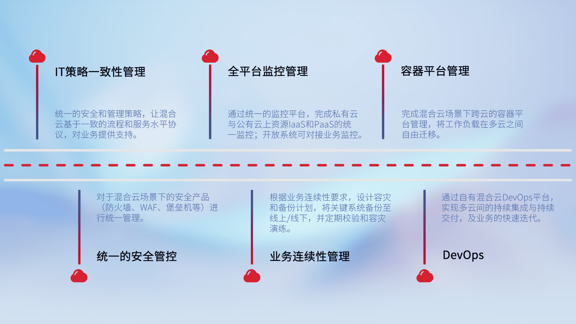 通过多云纳管,,以统一的资源数据模型把客户的云资源进行抽象和封装,,,进而实现对多云资源的统一操作,,,,保障云资源管理的可靠性、、、、稳定性与可用性。。。量身定制化运维内容,,,配置、、、开发运维、、补丁管理、、备份、、、、监控、、认证和访问管理、、、审计和日常巡检等,,,,保障在用云过程中的可靠度,,,稳定度以及高可用率。。