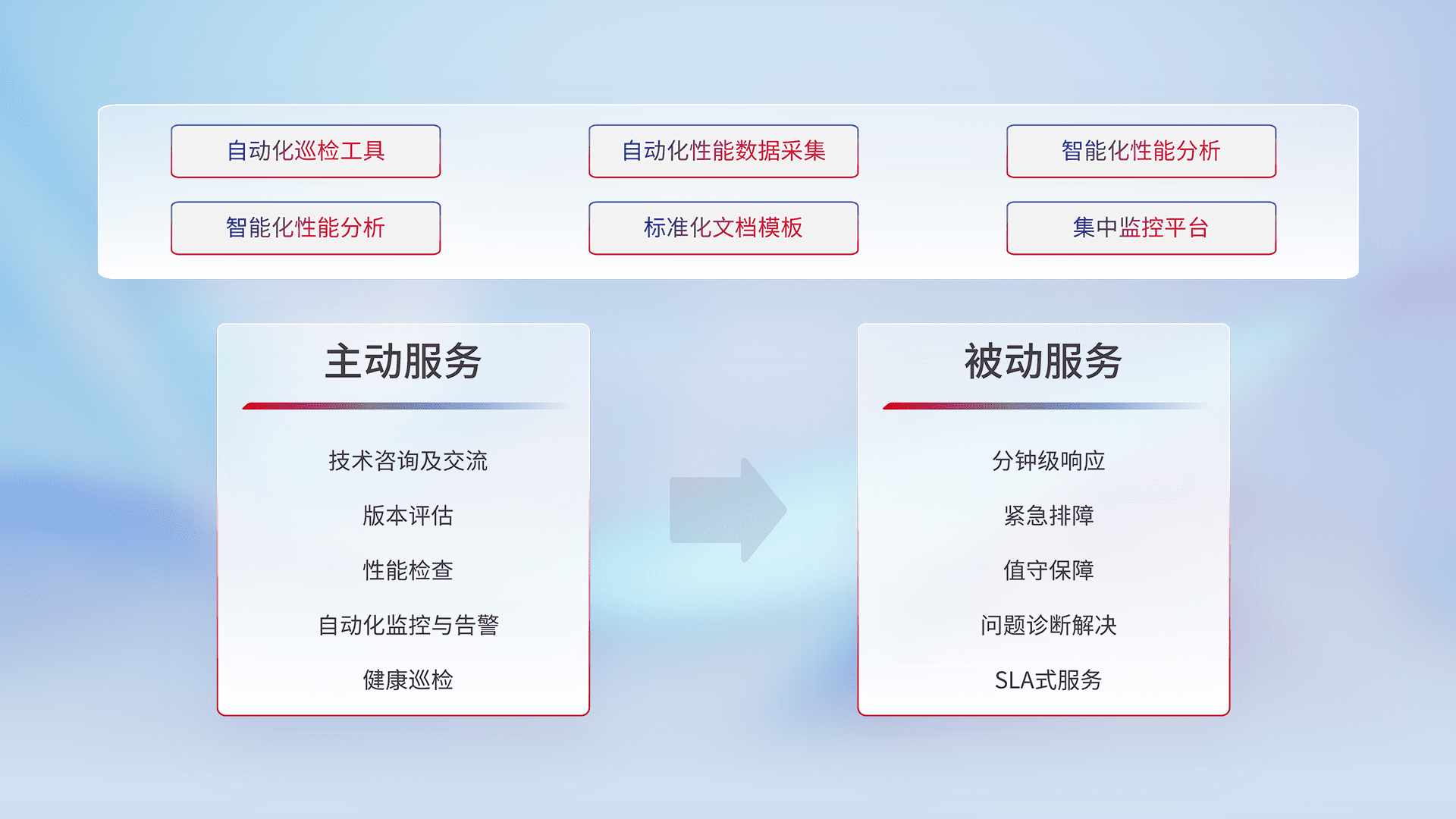 智能化工具和标准化文档,,,,保障服务质量,,,,提供主动服务(包含技术咨询、、、版本评估、、性能检查、、、自动化监控与告警、、、健康巡检)和被动服务包含(分钟级响应、、紧急排障、、、值守保障、、问题诊断解决、、、、SLA服务)。。。。